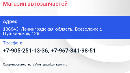 Магазин автозапчастей по адресу 188643, Ленинградская область, Всеволожск, Пушкинская, 128 в дальнейшем Организация, размещена в следующих категориях: