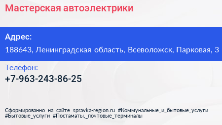 Мастерская автоэлектрики по адресу 188643, Ленинградская область, Всеволожск, Парковая, 3 в дальнейшем Организация, размещена в следующих категориях: