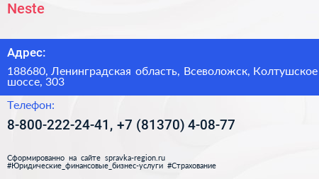 Neste по адресу 188680, Ленинградская область, Всеволожск, Колтушское шоссе, 303 в дальнейшем Организация, размещена в следующих категориях:
