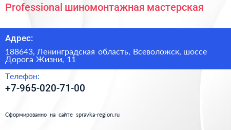 Professional, шиномонтажная мастерская по адресу 188643, Ленинградская область, Всеволожск, шоссе Дорога Жизни, 11 в дальнейшем Организация, размещена в следующих категориях:
