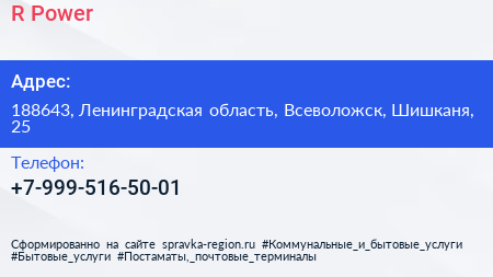 R. Power по адресу 188643, Ленинградская область, Всеволожск, Шишканя, 25 в дальнейшем Организация, размещена в следующих категориях: