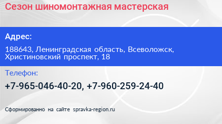 Сезон, шиномонтажная мастерская по адресу 188643, Ленинградская область, Всеволожск, Христиновский проспект, 18 в дальнейшем Организация, размещена в следующих категориях: