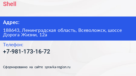 Shell по адресу 188643, Ленинградская область, Всеволожск, шоссе Дорога Жизни, 12а в дальнейшем Организация, размещена в следующих категориях:
