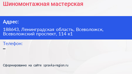 Шиномонтажная мастерская по адресу 188643, Ленинградская область, Всеволожск, Всеволожский проспект, 114 к1 в дальнейшем Организация, размещена в следующих категориях: