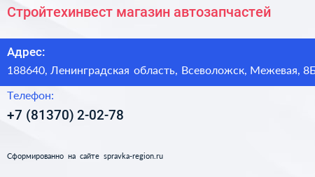 Стройтехинвест, магазин автозапчастей по адресу 188640, Ленинградская область, Всеволожск, Межевая, 8Б в дальнейшем Организация, размещена в следующих категориях: