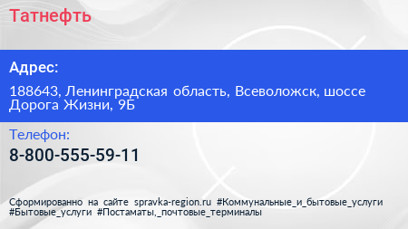 Татнефть по адресу 188643, Ленинградская область, Всеволожск, шоссе Дорога Жизни, 9Б в дальнейшем Организация, размещена в следующих категориях: