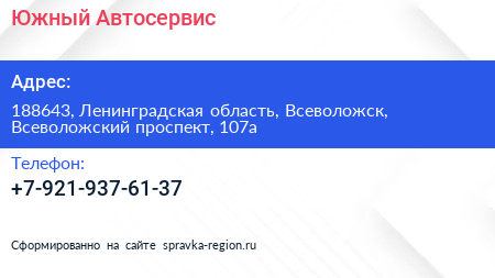 Южный Автосервис по адресу 188643, Ленинградская область, Всеволожск, Всеволожский проспект, 107а в дальнейшем Организация, размещена в следующих категориях: