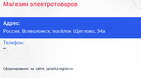 Магазин электротоваров по адресу Коопхозунивермаг плюс, 34А, Щеглово, Щегловское сельское поселение, Всеволожский район, Ленинградская область, Северо-Западный федеральный округ, 188676, Россия в дальнейшем Организация, размещена в следующих категориях: