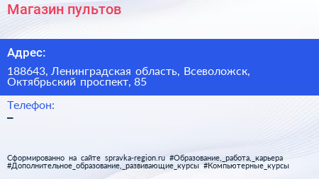 Магазин пультов по адресу 188643, Ленинградская область, Всеволожск, Октябрьский проспект, 85 в дальнейшем Организация, размещена в следующих категориях: