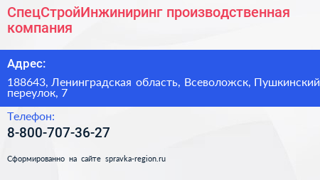 СпецСтройИнжиниринг, производственная компания по адресу 188643, Ленинградская область, Всеволожск, Пушкинский переулок, 7 в дальнейшем Организация, размещена в следующих категориях: