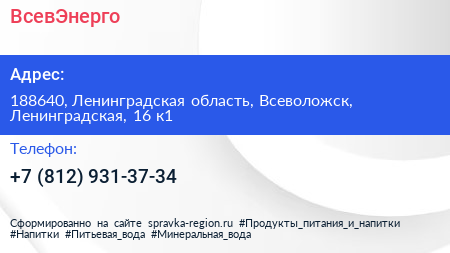 ВсевЭнерго по адресу 188640, Ленинградская область, Всеволожск, Ленинградская, 16 к1 в дальнейшем Организация, размещена в следующих категориях: