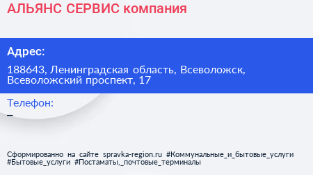 АЛЬЯНС СЕРВИС, компания по адресу 188643, Ленинградская область, Всеволожск, Всеволожский проспект, 17 в дальнейшем Организация, размещена в следующих категориях: