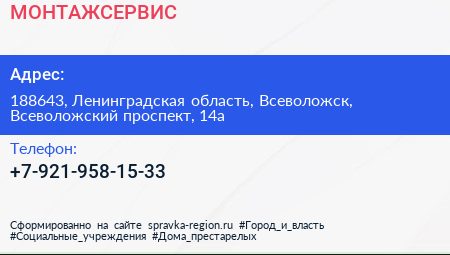 МОНТАЖСЕРВИС по адресу 188643, Ленинградская область, Всеволожск, Всеволожский проспект, 14а в дальнейшем Организация, размещена в следующих категориях: