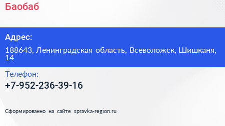 Баобаб по адресу 188643, Ленинградская область, Всеволожск, Шишканя, 14 в дальнейшем Организация, размещена в следующих категориях: