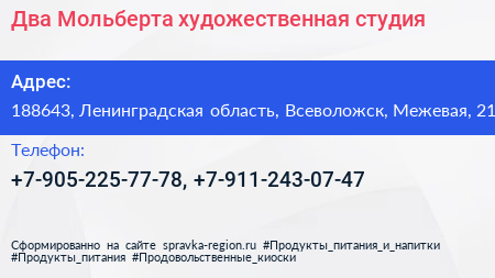 Два Мольберта, художественная студия по адресу 188643, Ленинградская область, Всеволожск, Межевая, 21 в дальнейшем Организация, размещена в следующих категориях: