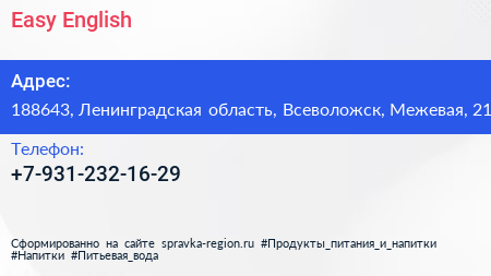 Easy English по адресу 188643, Ленинградская область, Всеволожск, Межевая, 21 в дальнейшем Организация, размещена в следующих категориях: