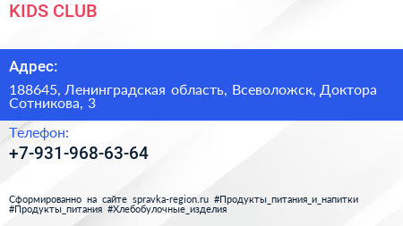 KIDS CLUB по адресу 188645, Ленинградская область, Всеволожск, Доктора Сотникова, 3 в дальнейшем Организация, размещена в следующих категориях:
