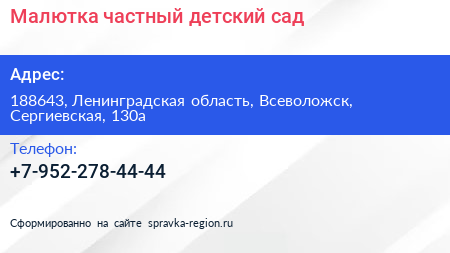 Малютка, частный детский сад по адресу 188643, Ленинградская область, Всеволожск, Сергиевская, 130а в дальнейшем Организация, размещена в следующих категориях: