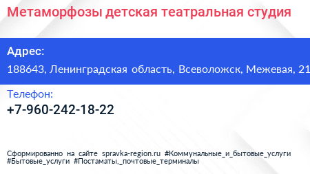 Метаморфозы, детская театральная студия по адресу 188643, Ленинградская область, Всеволожск, Межевая, 21 в дальнейшем Организация, размещена в следующих категориях: