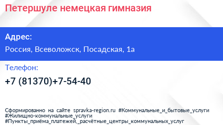 Петершуле, немецкая гимназия по адресу Гимназия "Петершуле" (филиал), Посадская улица, Воейково, Колтушское городское поселение, Всеволожский район, Ленинградская область, Северо-Западный федеральный округ, 188685, Россия в дальнейшем Организация, размещена в следующих категориях: