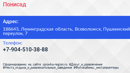 Понисад по адресу 188643, Ленинградская область, Всеволожск, Пушкинский переулок, 7 в дальнейшем Организация, размещена в следующих категориях: