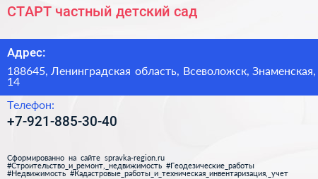СТАРТ, частный детский сад по адресу 188645, Ленинградская область, Всеволожск, Знаменская, 14 в дальнейшем Организация, размещена в следующих категориях: