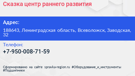Сказка, центр раннего развития по адресу 188643, Ленинградская область, Всеволожск, Заводская, 32 в дальнейшем Организация, размещена в следующих категориях: