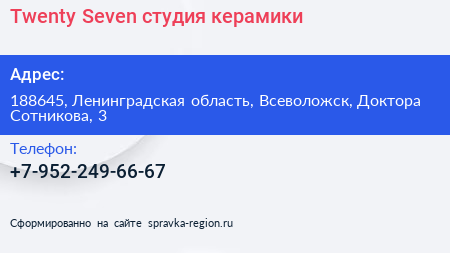 Twenty Seven, студия керамики по адресу 188645, Ленинградская область, Всеволожск, Доктора Сотникова, 3 в дальнейшем Организация, размещена в следующих категориях: