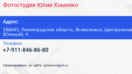 Фотостудия Юлии Хоменко по адресу 188645, Ленинградская область, Всеволожск, Центральная (Южный), 4 в дальнейшем Организация, размещена в следующих категориях: