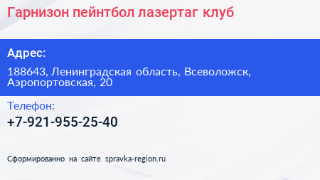 Гарнизон, пейнтбол-лазертаг клуб по адресу 188643, Ленинградская область, Всеволожск, Аэропортовская, 20 в дальнейшем Организация, размещена в следующих категориях: