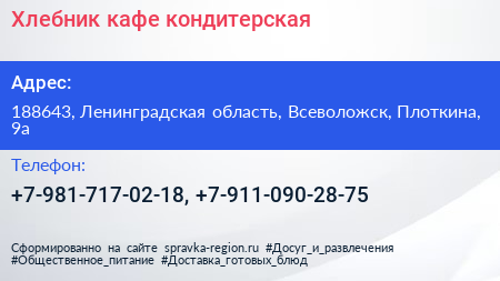 Хлебник, кафе-кондитерская по адресу 188643, Ленинградская область, Всеволожск, Плоткина, 9а в дальнейшем Организация, размещена в следующих категориях: