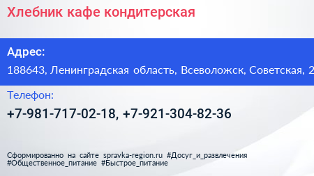Хлебник, кафе-кондитерская по адресу 188643, Ленинградская область, Всеволожск, Советская, 2 в дальнейшем Организация, размещена в следующих категориях:
