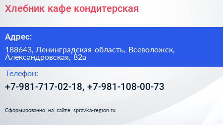 Хлебник, кафе-кондитерская по адресу 188643, Ленинградская область, Всеволожск, Александровская, 82а в дальнейшем Организация, размещена в следующих категориях: