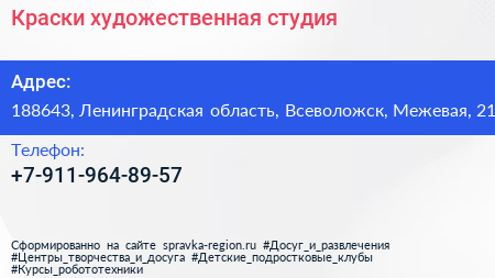 Краски, художественная студия по адресу 188643, Ленинградская область, Всеволожск, Межевая, 21 в дальнейшем Организация, размещена в следующих категориях: