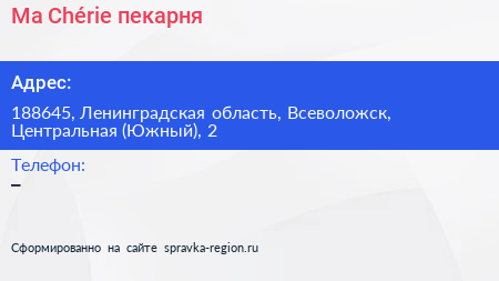 Ma Chérie, пекарня по адресу 188645, Ленинградская область, Всеволожск, Центральная (Южный), 2 в дальнейшем Организация, размещена в следующих категориях: