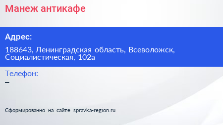 Манеж, антикафе по адресу 188643, Ленинградская область, Всеволожск, Социалистическая, 102а в дальнейшем Организация, размещена в следующих категориях:
