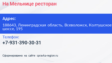 На Мельнице, ресторан по адресу 188643, Ленинградская область, Всеволожск, Колтушское шоссе, 195 в дальнейшем Организация, размещена в следующих категориях: