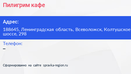 Пилигрим, кафе по адресу 188645, Ленинградская область, Всеволожск, Колтушское шоссе, 298 в дальнейшем Организация, размещена в следующих категориях: