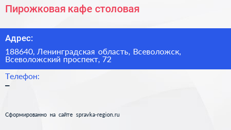 Пирожковая, кафе-столовая по адресу 188640, Ленинградская область, Всеволожск, Всеволожский проспект, 72 в дальнейшем Организация, размещена в следующих категориях: