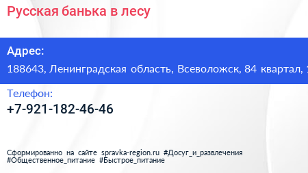 Русская банька в лесу по адресу 188643, Ленинградская область, Всеволожск, 84 квартал, 1 в дальнейшем Организация, размещена в следующих категориях: