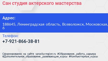 Сан, студия актерского мастерства по адресу 188645, Ленинградская область, Всеволожск, Московская, 6 в дальнейшем Организация, размещена в следующих категориях: