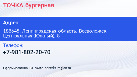 ТОЧКА, бургерная по адресу 188645, Ленинградская область, Всеволожск, Центральная (Южный), 8 в дальнейшем Организация, размещена в следующих категориях: