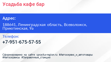 Усадьба, кафе-бар по адресу 188641, Ленинградская область, Всеволожск, Приютинская, 9а в дальнейшем Организация, размещена в следующих категориях: