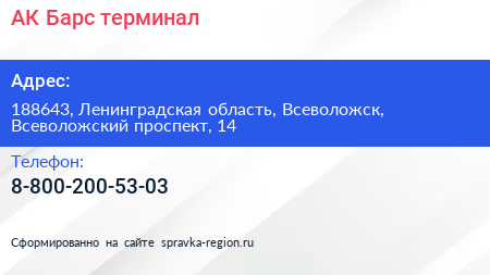 АК Барс, терминал по адресу 188643, Ленинградская область, Всеволожск, Всеволожский проспект, 14 в дальнейшем Организация, размещена в следующих категориях: