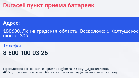 Duracell, пункт приема батареек по адресу 188680, Ленинградская область, Всеволожск, Колтушское шоссе, 305 в дальнейшем Организация, размещена в следующих категориях: