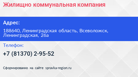Жилищно-коммунальная компания по адресу 188640, Ленинградская область, Всеволожск, Ленинградская, 26а в дальнейшем Организация, размещена в следующих категориях: