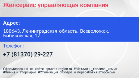 Жилсервис, управляющая компания по адресу 188643, Ленинградская область, Всеволожск, Бибиковская, 17 в дальнейшем Организация, размещена в следующих категориях: