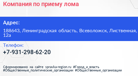Компания по приему лома по адресу 188643, Ленинградская область, Всеволожск, Лиственная, 12а в дальнейшем Организация, размещена в следующих категориях: