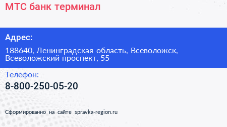 МТС банк, терминал по адресу 188640, Ленинградская область, Всеволожск, Всеволожский проспект, 55 в дальнейшем Организация, размещена в следующих категориях:
