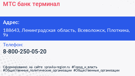 МТС банк, терминал по адресу 188643, Ленинградская область, Всеволожск, Плоткина, 9а в дальнейшем Организация, размещена в следующих категориях:
